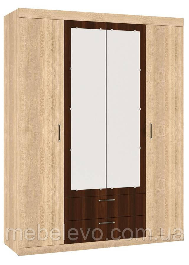 Широка шафа допоможе вам з наведенням порядку в спальні, адже вона володіє відмінною місткістю. Шафа складається з чотирьох дверей, дві центральні двері мають дзеркальні вставки.Наповнення шафи наступне: зліва розташовані штанга для одягу, над нею - широка Полиця, праворуч-п'ять полиць. Зовні шафи розташовані два висувних ящика на роликових напрямних.Прямокутні дзеркала на фасаді дозволяють не тільки побачити себе, але і візуально розширюють простір.