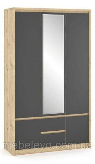 Це не тільки стильна, але і функціональна шафа, яка завжди помістить ваші нові наряди.Модель обладнана трьома дверима, які забезпечують легкий доступ до одягу. За лівою і середньою дверима знаходиться відділення зі штангою, за правою дверцятами - три полиці, за двома нижніми дверцятами - по одному відділенню, а внизу посередині дві висувних шухляди. Середні двері оснащені дзеркальною вставкою, яка здатна візуально розширити простір спальні і зробити інтер'єр більш вишуканим і благородним.В якості ручок використовується поглиблення в фасадах.