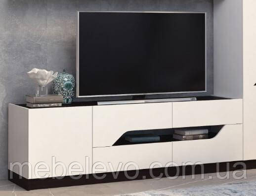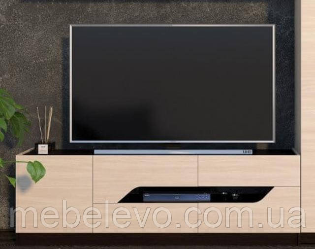 Тумба виконана з великою кількістю корисного простору для зберігання необхідних речей, аудіо - та відеотехніки.Вона складається з чотирьох висувних ящиків на телескопічних направляючих, і вбудованої тумби з орними дверцятами збоку. Так само тумба має на увазі розташування на ній телевізора з великою діагоналлю.Декоративні вирізи на фасадах служать ручками.