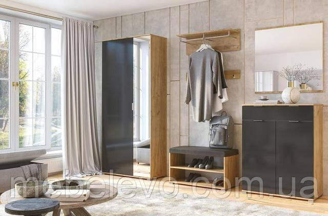 Фурнітура:завіса підвищеної міцності з плавним закриттям, з`єднання деталей за допомогою ексцентрикової стяжки (MINIFIX), алюмінієва профільна ручка, пластмасова ніжка, покрита сатином в колір ручки, у шафі застосовується посилений мікроліфт (вішалка виїзна).
