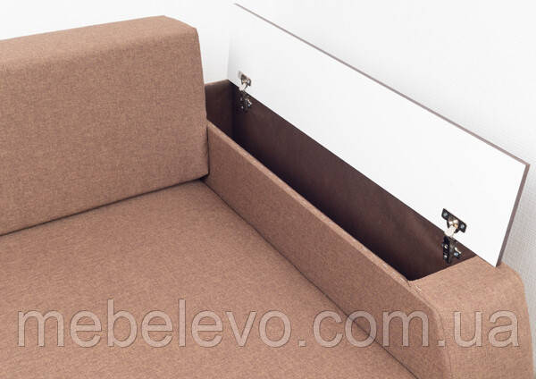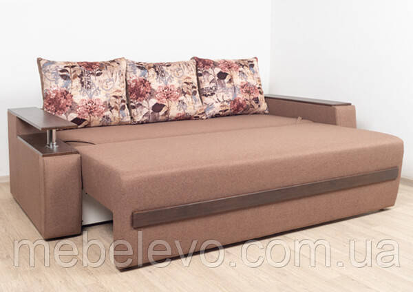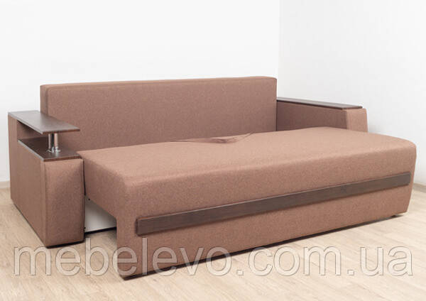 Каркас - натуральне дерево і фанера. Підлокітники-накладки з ламінованого ДСП. У дивана є задня планка і місткий короб для білизни. У підлокітнику з полицею є ніша з баром. Диван підходить для щоденного сну.