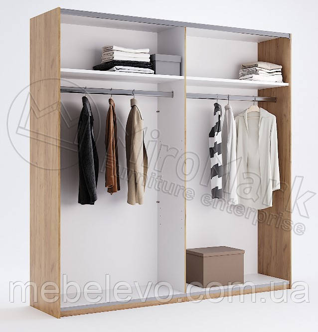 Шафа не тільки дуже красивий, але і дуже місткий. Шафа-купе складається з двох розсувних дверей. За двома дверками приховані дверками дві штанги для одягу та дві полиці, що забезпечить акуратне зберігання Вашого одягу.Шафа-купе може комплектуватися дзеркалом в повний зріст, яке візуально розширить простір кімнати. Виробник також пропонує великий вибір додаткових опцій до шафи-купе, які роблять шафа-купе більш красивим і зручним. Ви можете самі вибрати додаткові полиці, карниз з підсвічуванням або без неї, плавне закриття дверей, а також блок ящиків.