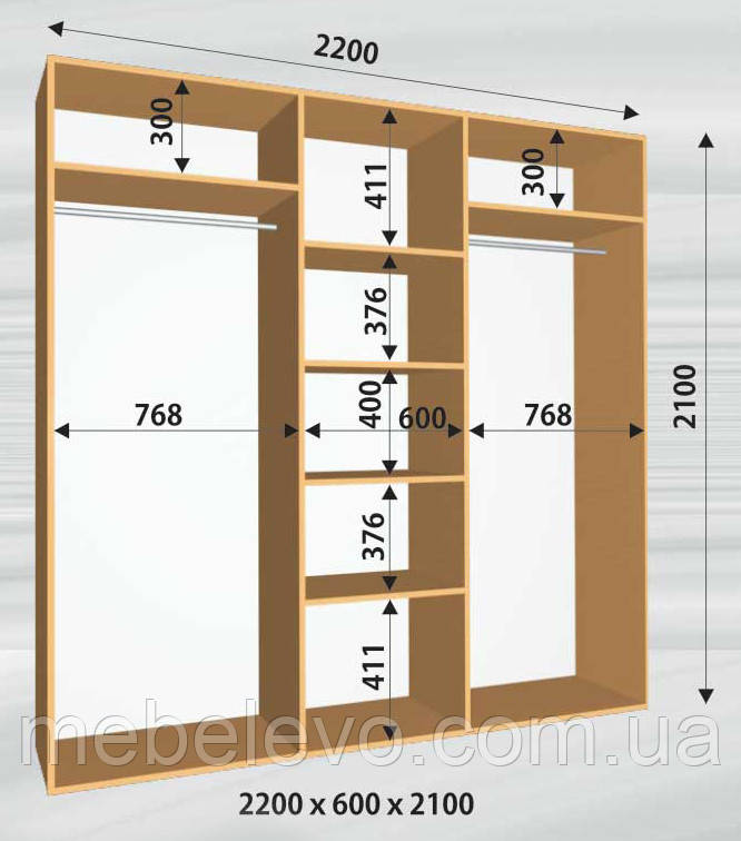 Розміри: Висота - 2100 мм; Ширина - 2200мм; Глибина - 600мм