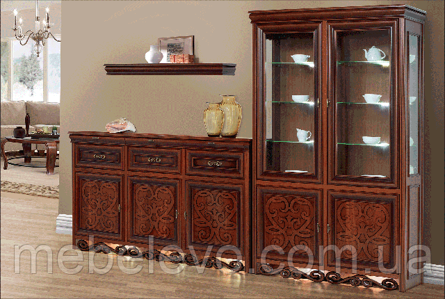 Вітрина 2Д "Хлоя" вражає своїм прекрасним дизайном і перетворить будь-яку вітальню! Вітрина представлена у кольорі благородного горіха, який гідно прикрасить приміщення в класичному стилі! Цікава різьблення, декоративний малюнок, а також лаковані фасади з патиною і фацетная обробка скла надають вітрині помпезності,аристократичності і елегантності.А підсвічування скляних поличок надає їй ще й неповторного шарму!